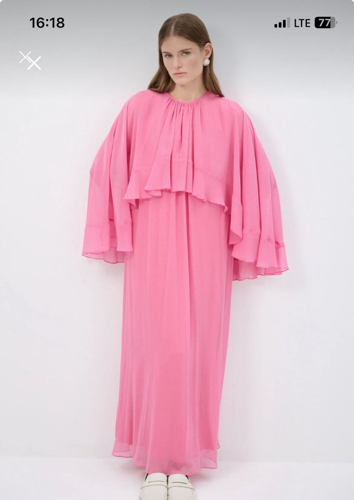 Yüksek yakalı, uzun kollu, drapeli pembe uzun elbise. Gevşek kesimli, satenimsi kumaştan, pastel tonlarda ve desensiz. Günlük kullanım için avant-garde ve normcore tarzında.