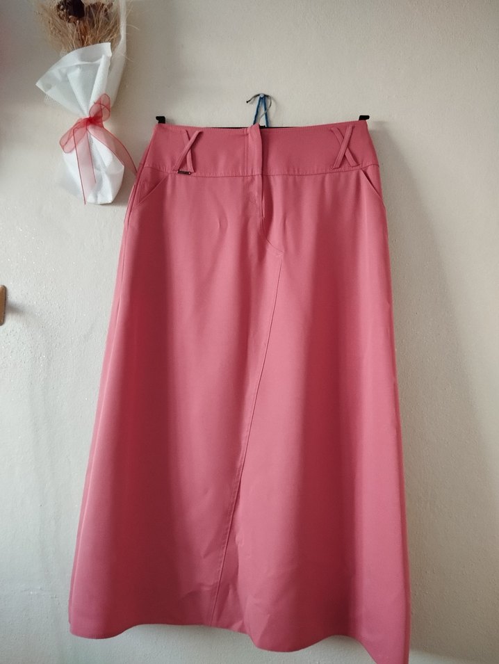 Pembe renkte, drapeli tasarıma sahip uzun kadın eteği. Düz, minimalist ve sentetik kumaştan üretilmiştir. Günlük kullanıma uygundur.