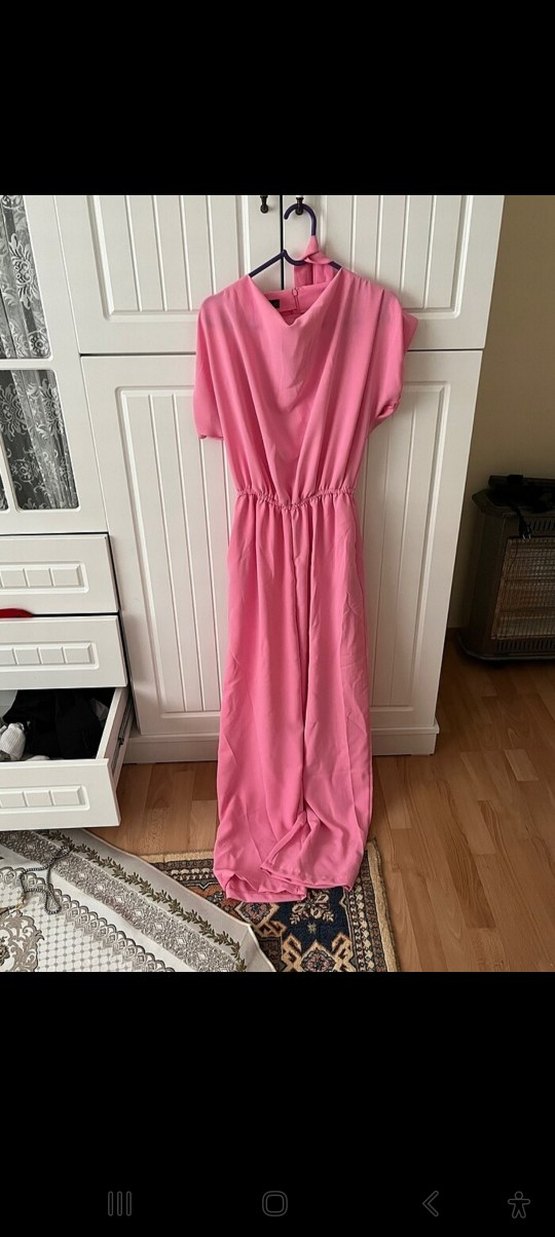 Pembe renkli, drapeli ve bol kesim uzun Tulum İpek gibi dokusu, kayık yaka ve askılı kollarıyla modern klasik tarzda, romantik akşamlar için uygundur.
