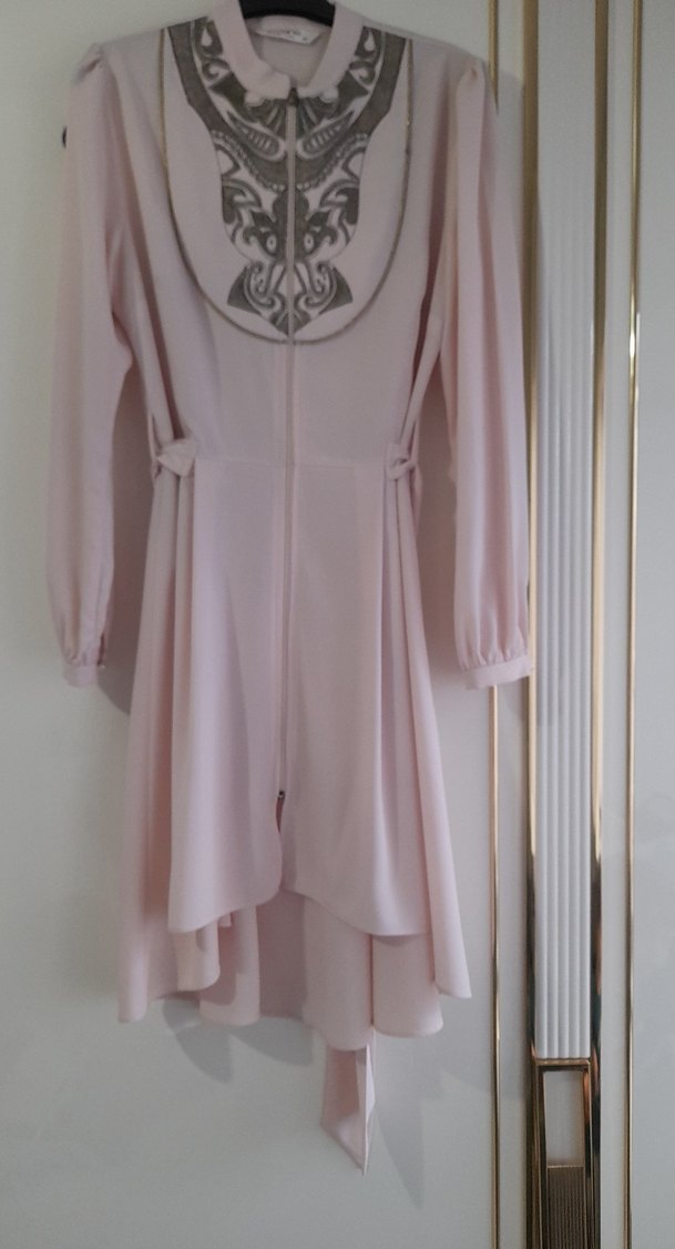 Pembe pastel tonlarda, drapeli uzun kollu ve yüksek yakalı, bol kesim uzun abiye elbise. Modern klasik tarzda, düğün için uygun bir modeldir.