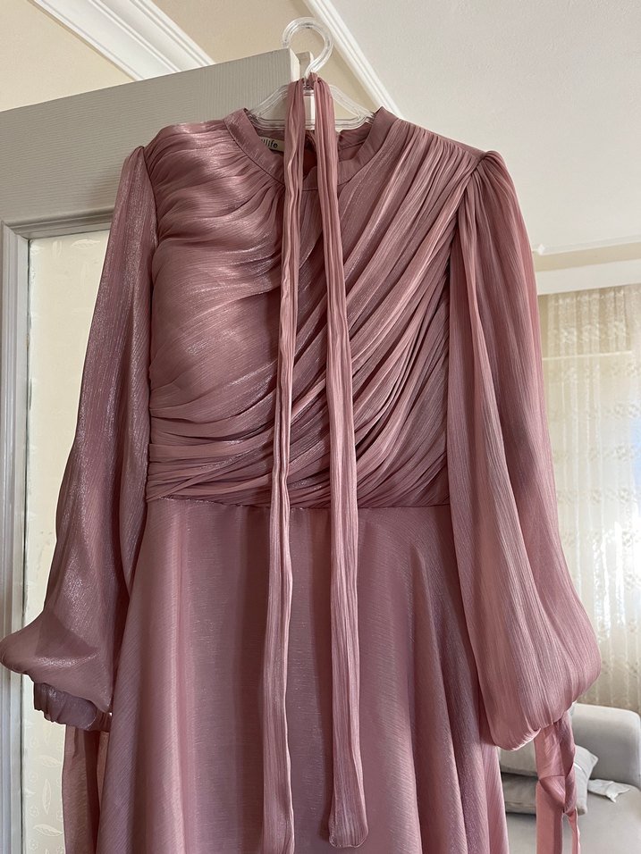 Drapeli tasarımı ve yüksek yakasıyla pembe, uzun kollu, vücuda oturan abiye elbise. Düz ve şık kumaştan, düğünler için uygun.