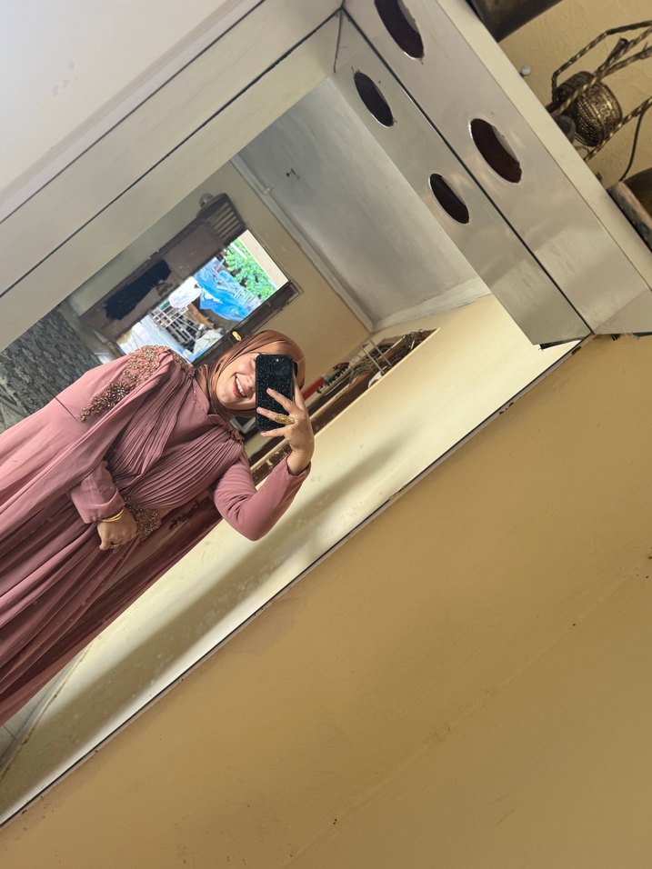 Pembe pastel renkli, uzun kollu ve drapeli detaylara sahip bu uzun elbise, yüksek yakalı ve ince kesimdir. İpek gibi yumuşak kumaştan üretilmiştir, modest düğün kıyafeti olarak uygundur.