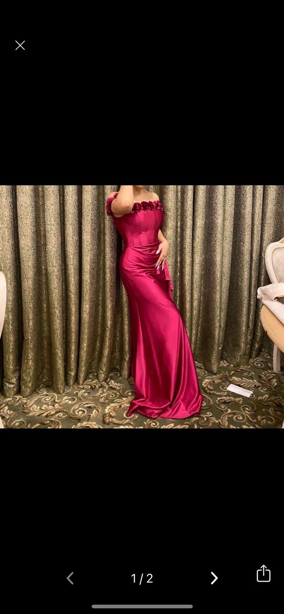 Parlak pembe, drapeli detaylara sahip, straplez yaka ve dar kesim uzun elbise, düğünler için uygun.