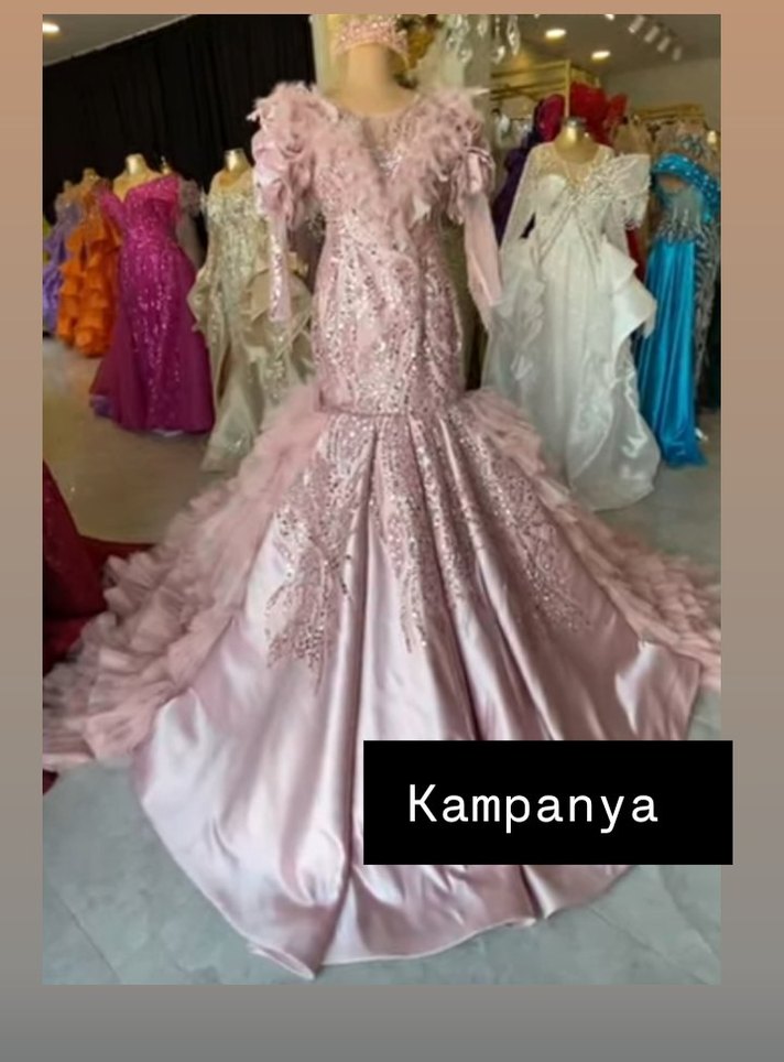 Açık pembe, straplez yakalı ve askılı kol detaylı, drapeli ve desenli uzun abiye elbise. Klasik zarafeti ve bohem şıklığı yansıtır. Düğünler için uygundur.