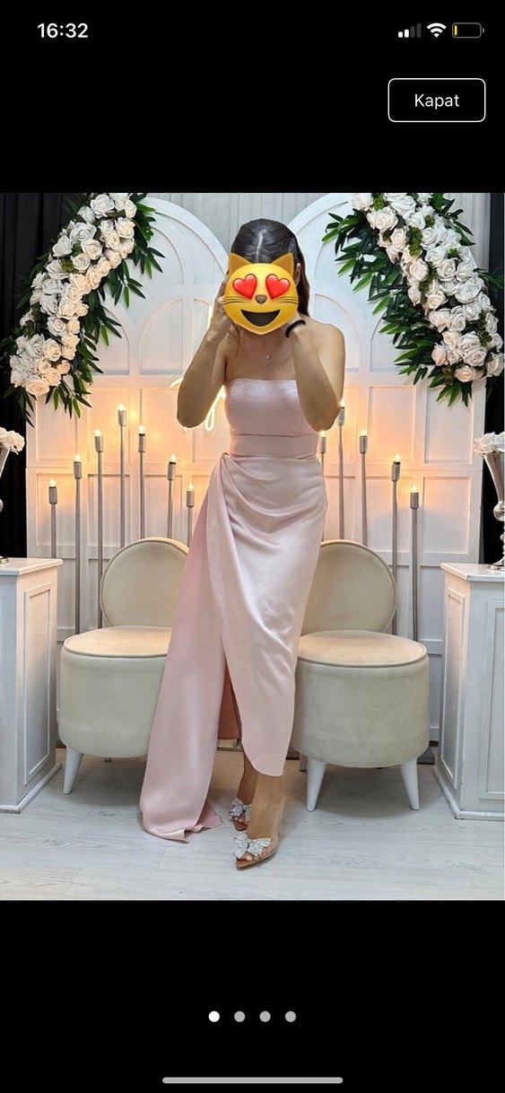 Açık pembe renkli, straplez uzun abiye elbise, drapeli detaylar ve ince askılarla şık bir görünüm sunar.