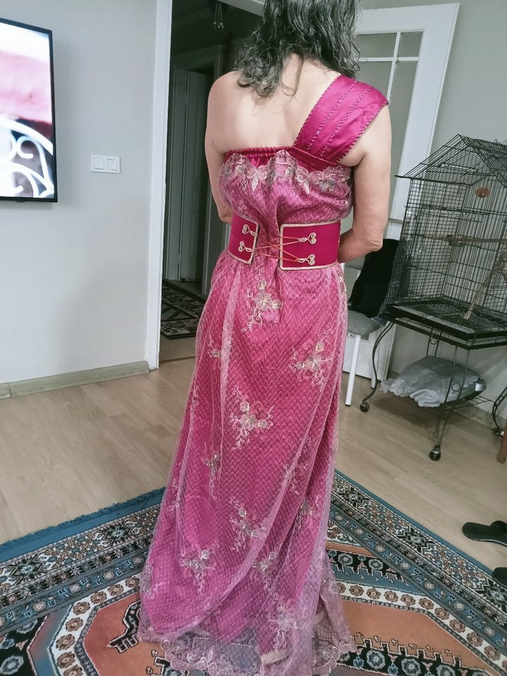 Pembe parlak, desenli kumaştan, drapeli ve straplez uzun elbise. Bohem tarzda, bol kesim, düğün ve özel etkinlikler için uygun.