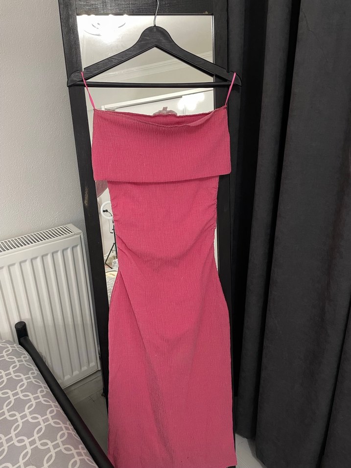 Pembe Drapeli Uzun straplez Elbise
