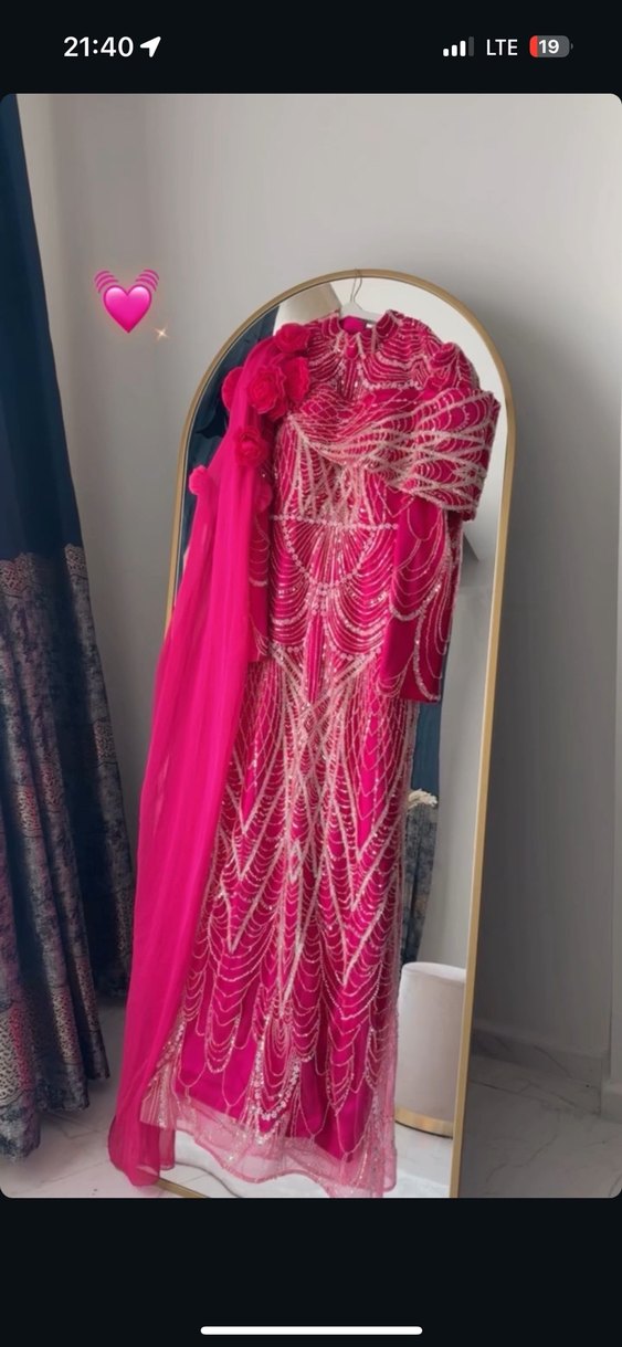 Drapeli tasarımı ve straplez yakasıyla pembe, uzun ve dar kesim abiye. Parlak desenli kumaşı düğünler için uygun.