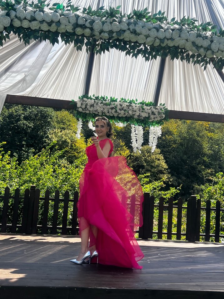 Pembe renkli, straplez yaka ve drapeli, bol kesim tasarıma sahip uzun abiye, avangart düğünler için uygundur.