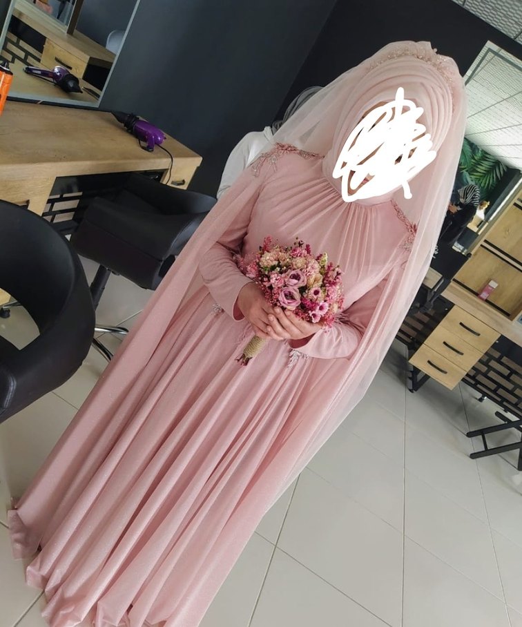 Pembe Drapeli Uzun Tesettür Nişan Elbisesi
