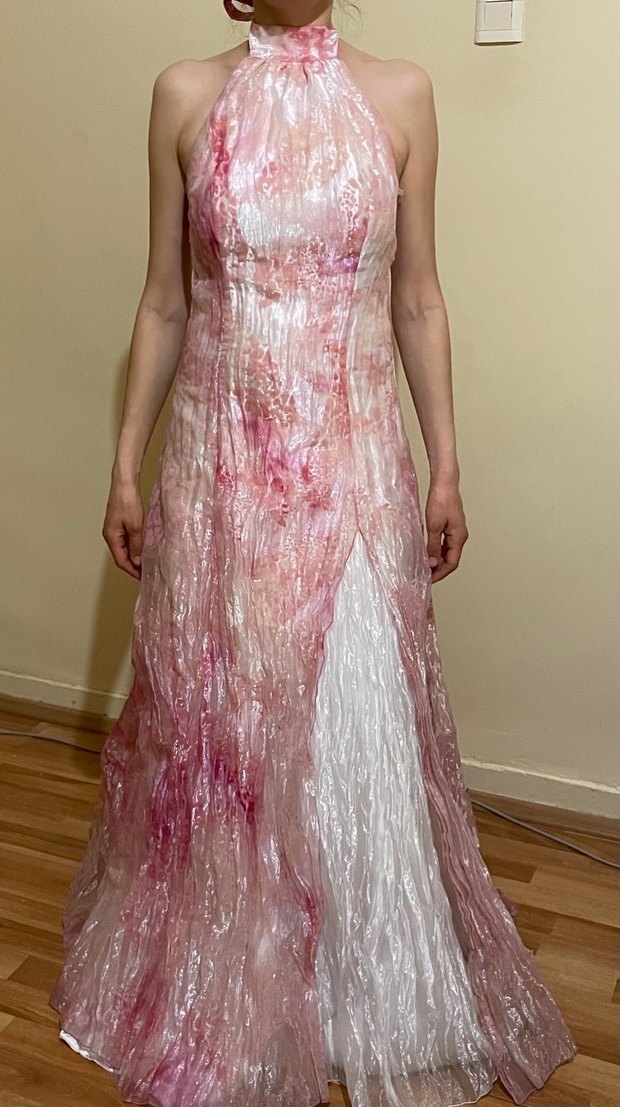 Askısız ve kolsuz, vücuda oturan kesimiyle drapeli, pastel pembe tie-dye desenli uzun elbise, bohem düğün stili için ideal. Mezuniyet için alınıp sadece 1 kere giyilmiş abiye elbise. Boyundan bağlamalı 175 cm boya uygun. Boyum 164 yüksek topukluyla giydim çok şık durdu. İçi kat kat kumaş (en alt kısmı tül) tarlatan varmış gibi görünüyor. Sırt dekolteli, organze kumaş şal hediye edeceğim.