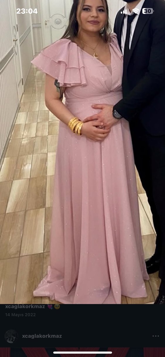 Bu açık pembe nişan elbisesi, drapeli tasarımı, v yaka ile dikkat çeker. Askılı kollara sahip olup modern klasik tarzda, gösterişli bir görünüm sunar. ✨ Ben 7 aylık hamileyken giydim 46-48 beden ile uyum sağlar. Daraltmaya da müsait. Ev tipi söz nişan için de uygundur. Almayı düşünene fotoğraflarını atarım.