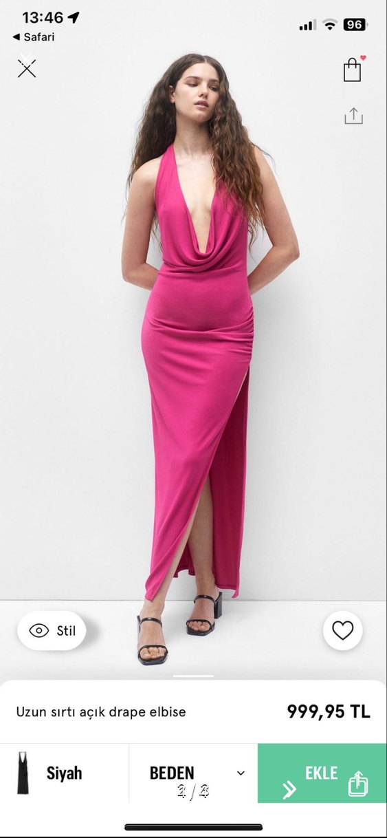 Bu pembe, parlak ve ipek gibi kumaştan yapılmış, drapeli V yakalı, askılı uzun ve vücuda oturan elbise, romantik akşamlar için uygundur. ✨
