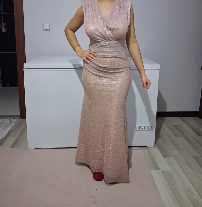 Bu açık pembe uzun abiye elbise, drapeli V yaka ve ince askılı kollarla klasik bir şıklık sunar. Hafif yılan deseniyle modern bir görünüm sağlar. kolları vatkalı, üst kabı mevcut içi astarlı göğüs kısmı pot duruyor çünkü orası biraz dekolteli kendinize göre yaptırabilirsiniz pembe simli çok tatlı bir rengi var 1.70 boyum 70 kiloyum