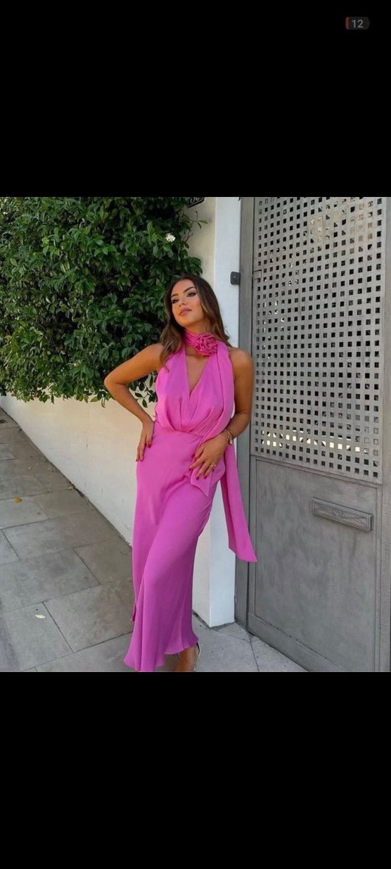 Pembe, drapeli ve V yakalı, kolsuz uzun elbise. İpek gibi kumaştan, rahat kesim ve pastel desenli. Romantik akşamlar için uygun.