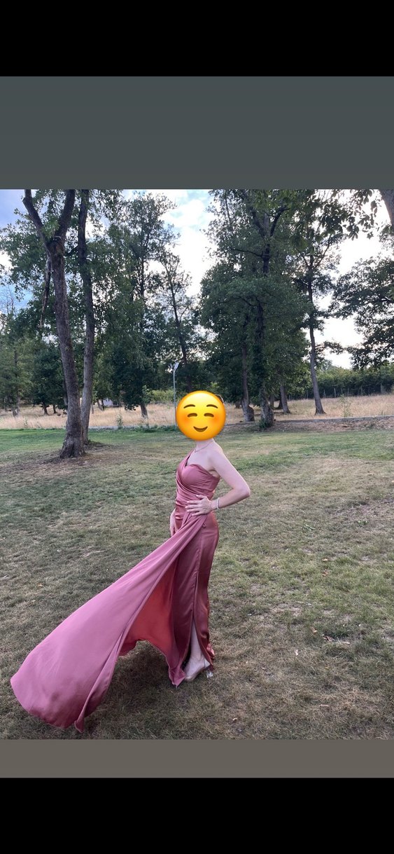 Pembe parlak kumaştan, drapeli ve straplez yırtmaçlı uzun kadın abiyesi. Fitted kesimi ve kolsuz tasarımıyla düğünler için uygun. Bir kere giyildi temizdir kusuru yoktur