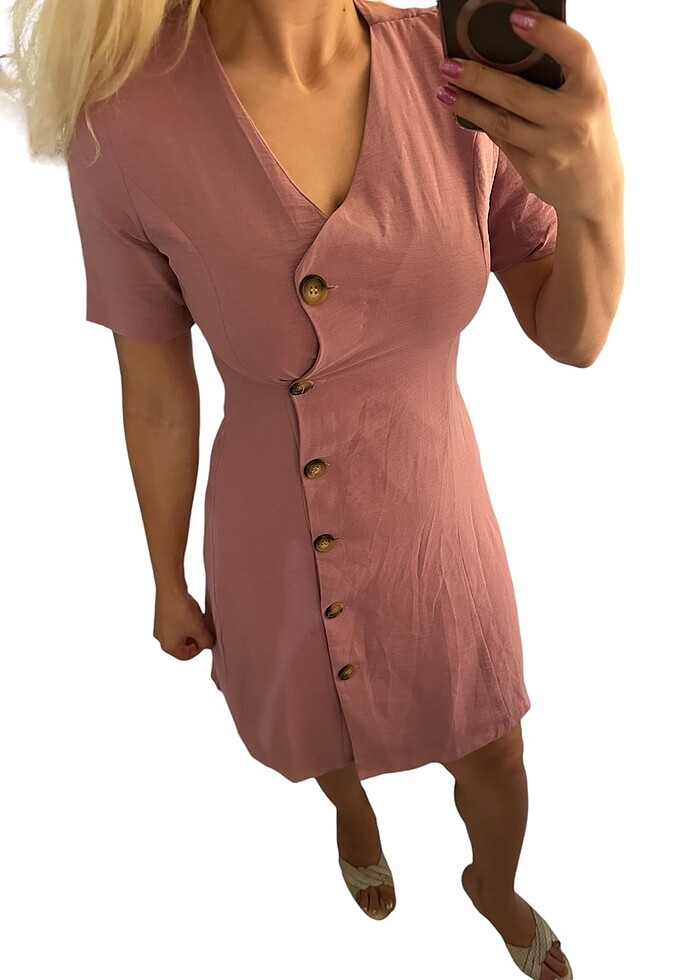 Ürün tatlı pembe rengi, önden düğmeli model bayan elbisedir. Midi boydur. 38 bedendir .