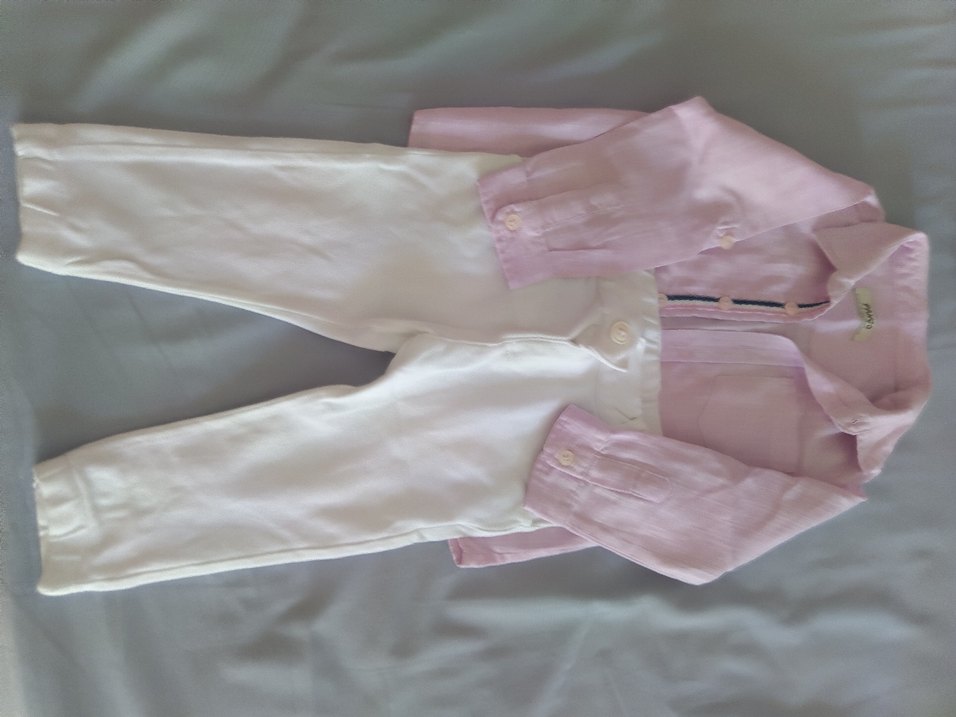 Pastel pembe, düğmeli, yakalı ve uzun kollu gömlek ile beyaz pamuklu pantolonlu bebek erkek takımı.