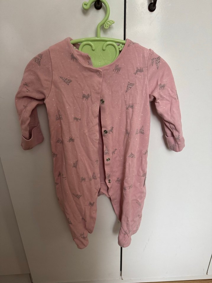 Pastel pembe renkli, düğmeli bebek kız tulumu. Yumuşak kumaş ve hafif baskılı detaylara sahip. 3-6 ay