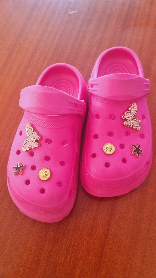 Yumuşak kauçuktan, düğmeli kayışlı pembe çocuk terlikleri, işlemeli kelebek ve yıldız detaylarıyla renkli bir görünüm sunar.