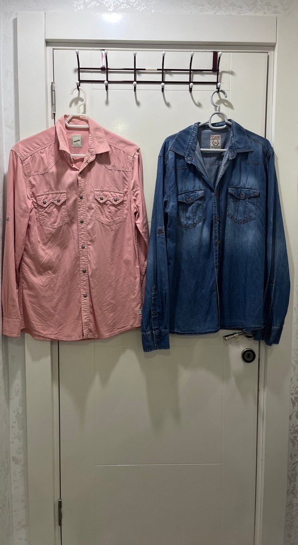 Pastel pembe renkli, düğmeli gömlek mavi renkli düğmeli kot gömlek Pastel Pembe gömlek (Defacto S beden ) Mavi gömlek (Xsıde M beden )