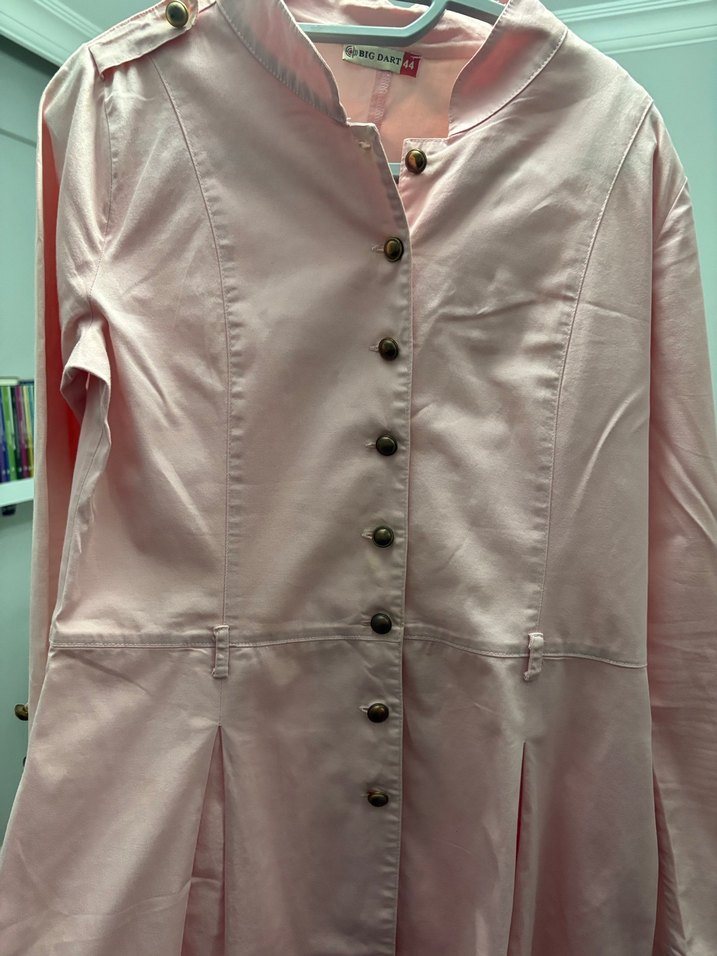 Pembe renkte, düğmeli ve uzun kollu hamile kaban. Normal kesim, ipeksi dokulu ve ofis kullanımı için uygundur. ✨ Deformasyonları var düğmelerinde ve ikinci görselde görüleceği üzere lekelenme