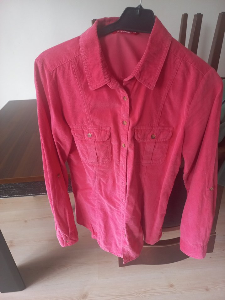 Pembe kadife fitilli gömlek, düğmeli ön, uzun kollu ve kesik yakalıdır. Bol kesim ve parlak dokusuyla günlük kullanıma uygundur.
