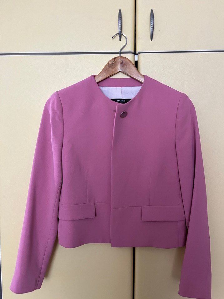 Mango markalı blazer Pembe renkte, düğmeli, uzun kollu, normal kesim kadın ceket. Ofis için uygun, sade ve şık tasarıma sahip, ipeksi dokulu kumaştan.
