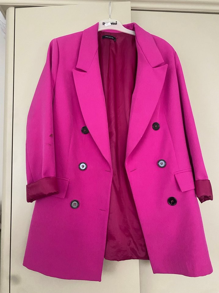 Canlı pembe renkli, düğmeli kadın blazer ceket. Normal midi boyda, uzun kollu ve regular fit. Ofis için uygun, sokak tarzı ve şık görünüme sahip.