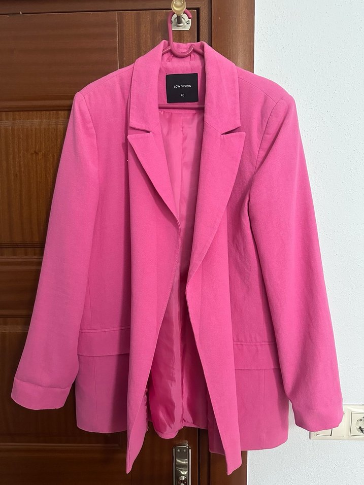 Pembe renkte, düğmeli, notched lapel yakalı, uzun kollu, normal midi uzunlukta kadın blazer ceket. Sentetik kumaştan üretilmiş, iş ve günlük şıklık için uygun.