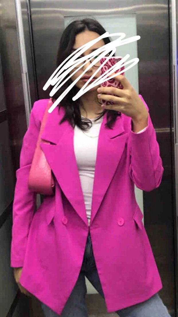 Pembe, düğmeli, uzun kollu kadın blazer ceketi. Notch yaka ve midi uzunlukta, yumuşak sentetik kumaştan. Günlük ve iş kombinlerine uygun. 38beden mezuniyet de giyildi sadece