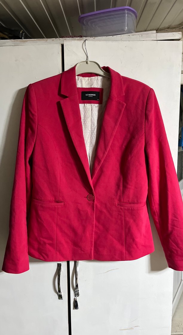 Pembe, düğmeli kadın blazer ceket. Normal kesim, uzun kollu ve normal midi boyda. Parlak sentetik kumaştan, ofis kullanımı için uygun.