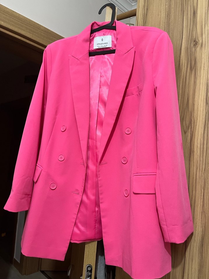 Pembe renkte, düğmeli, notched lapel yakalı kadın blazer ceket. Normal boy, regular fit ve parlak sentetik kumaştan üretilmiştir. Ofis için uygun, trend normcore tarzında.