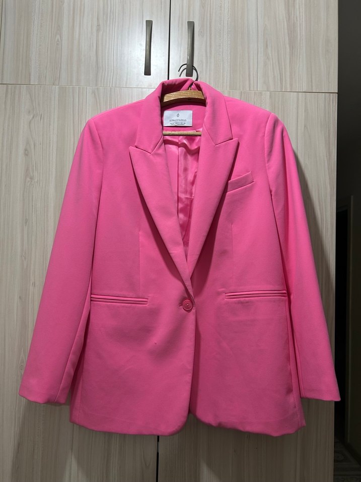Pembe renkli, düğmeli ve uzun kollu kadın blazer ceket. Normal kesim ve midi boyda, sentetik kumaştan üretilmiştir. Ofis için klasik ve şık bir seçenek.