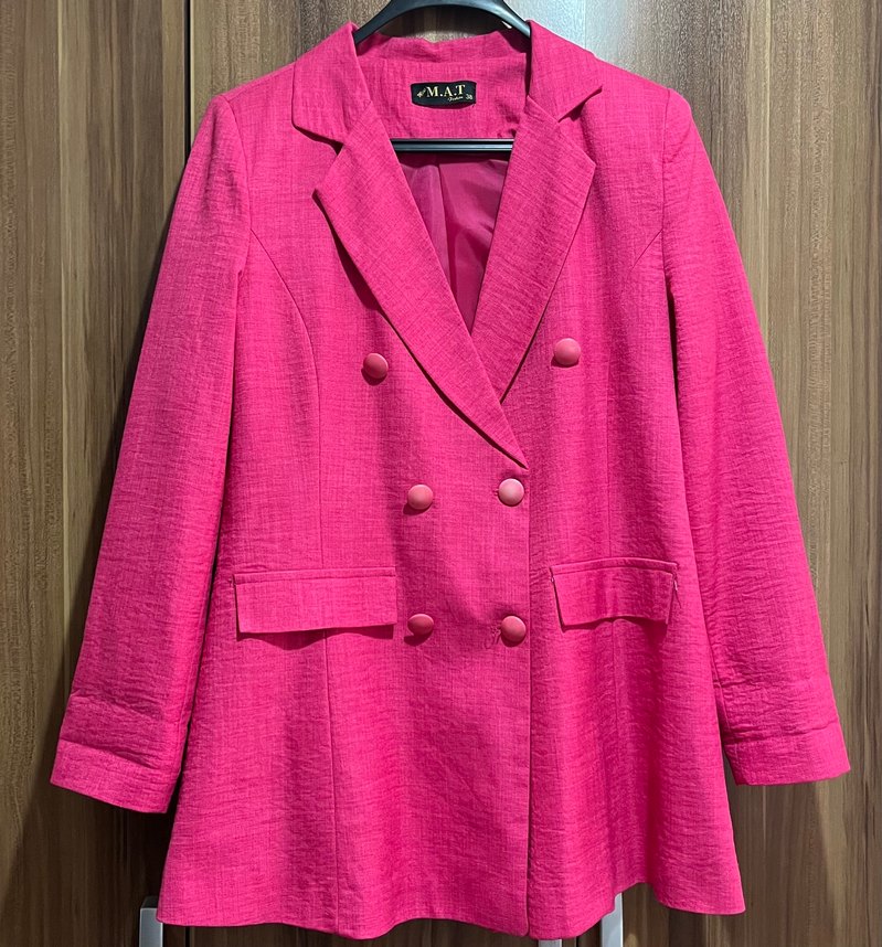 Pembe renkli, keten kumaştan yapılmış, düğmeli ve yakalı kadın blazer. Uzun kollu, midi boy ve normal kesim, ofis için uygun, desen yok. M.A.T etiketli.