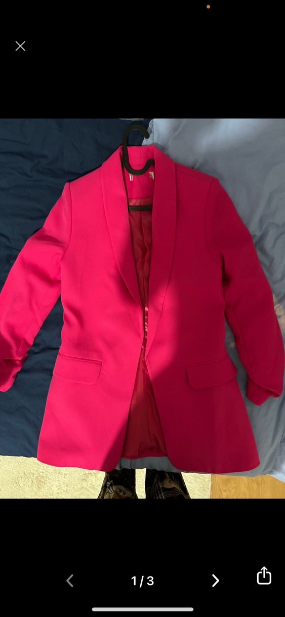 Pembe renkli kadın blazer ceket, düğmeli ve uzun kolludur. Normal kesim ve midi boyda, sentetik kumaştan üretilmiştir. Ofis ve günlük kullanıma uygundur.