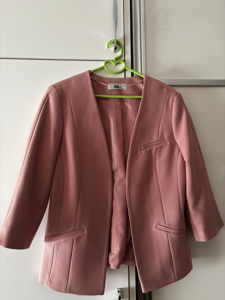Pembe pastel tonlarında, düğmeli ve uzun kollu, normal boyda kadın blazer ceket. İpeksi dokusu ve kesimiyle ofis kullanımı için uygundur.
