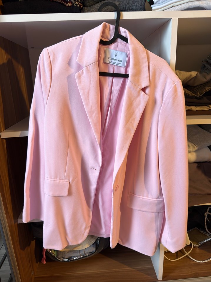 Pembe renkli, düğmeli ve yakalı kadın blazer ceket. İpek gibi kumaştan, normal midi boyda ve rahat kesimdir. Ofis için uygun, desen içermez.