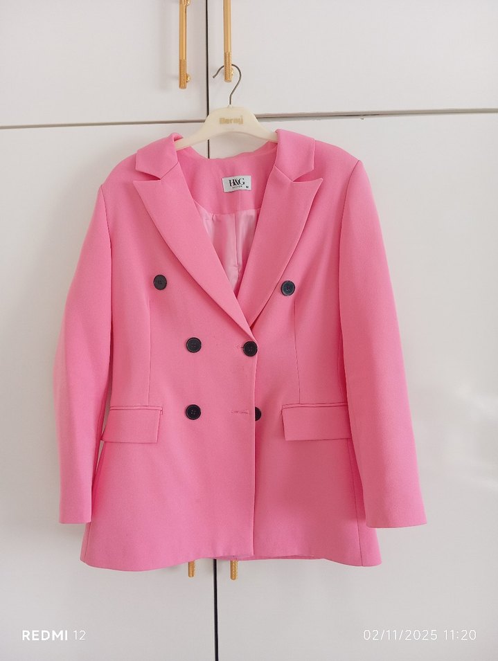 Pastel pembe renkte, yakalı ve düğmeli kadın blazer ceket. Sentetik kumaştan, normal midi boyda, uzun kollu bir kere giyildi acil satılıktır