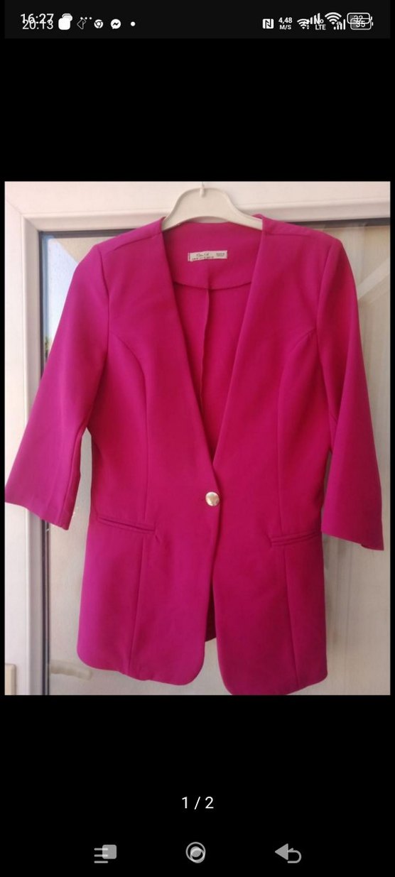 Pembe, düğmeli, uzun kollu kadın blazer. Normal uzunlukta, regular fit ve parlak dokulu, ofis kullanımına uygun.