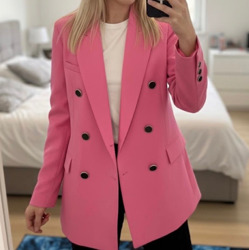 Pembe düğmeli kadın blazer ceket, uzun kollu ve normal kesimdir. Ofis için uygun midi boyda, düz ve şık bir tasarıma sahiptir.