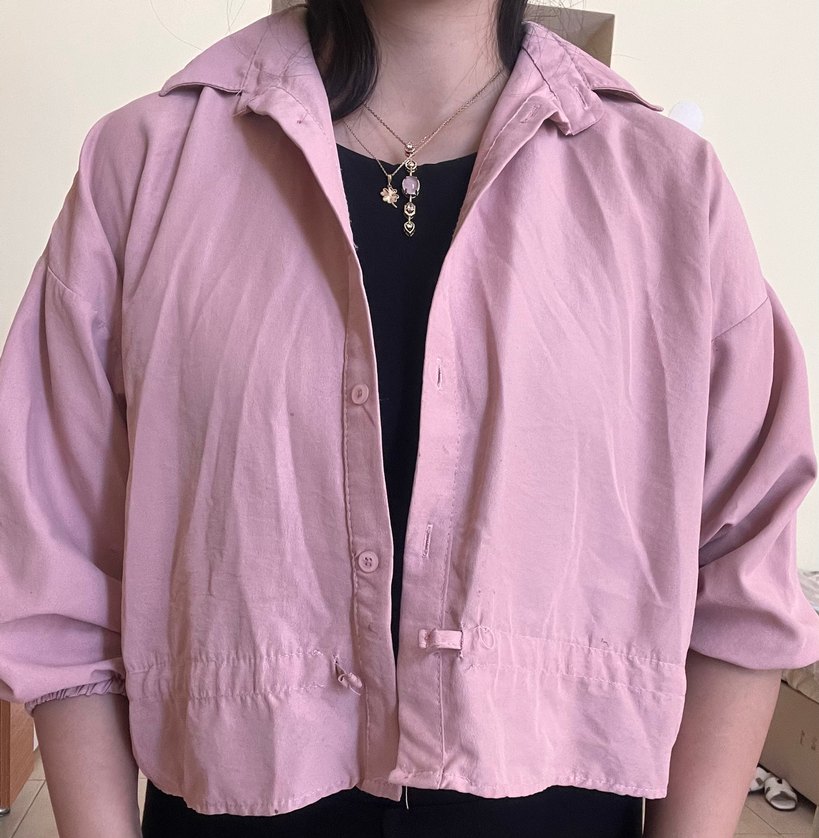 Pembe, düğmeli, yakalı ve uzun kollu kadın gömleği. Gevşek kesim ve ipeksi dokusuyla günlük kullanıma uygun midi boyda.