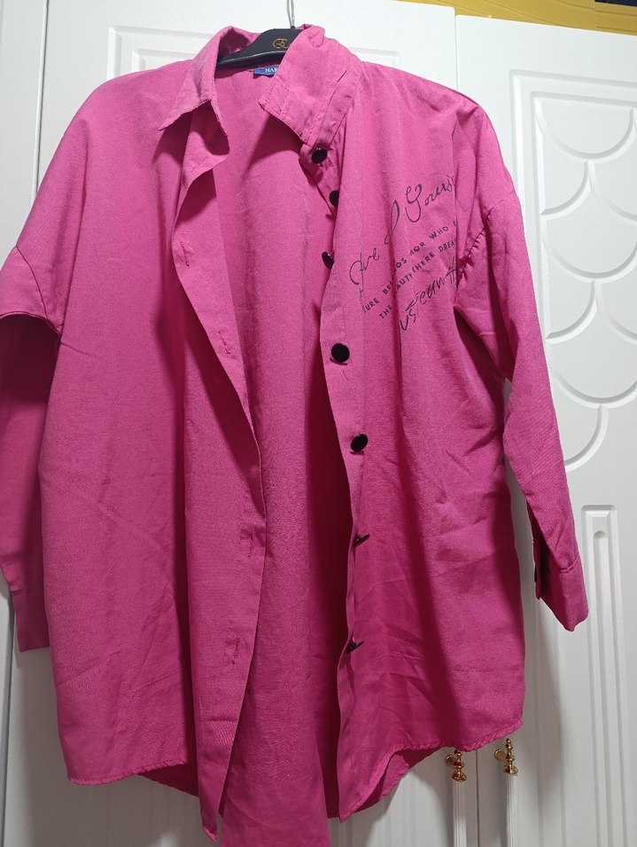 Pembe k uzun kollu, düğmeli ve yakası kırmalı kadın gömleği. Siyah düğmeler ve baskılı yazı detaylı, rahat sokak stili için uygundur.