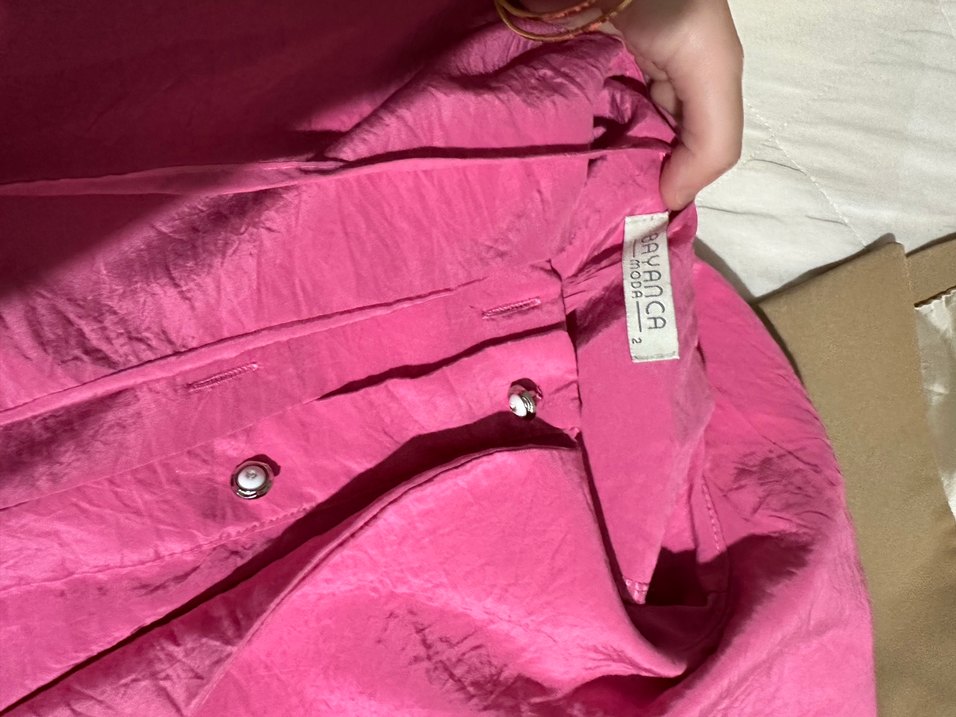 Pembe parlak, düğmeli, uzun kollu, notched lapel yakalı, bol kesim kadın gömleği. İpek gibi yumuşak kumaştan, baskılı desene sahip, sokak modasına uygun.