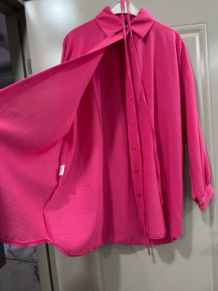 Pembe, düğmeli, uzun kollu, yakalı, bol kesim kadın gömleği. Parlak sentetik kumaştan, midi boyda ve desensizdir. Günlük kullanıma uygundur.