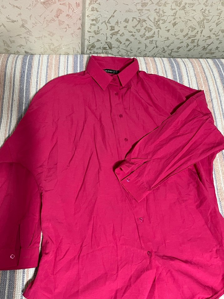 Kadınlar için keten kumaştan, düğmeli, uzun kollu, yakalı ve parlak pembe renkte, rahat kesim gömlek. Günlük kullanıma uygundur. Herhangi bir sorunu yoktur Sıfır ürün #gömlek