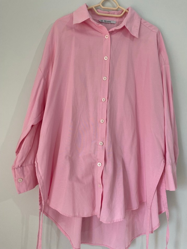 Pembe kumaştan, düğmeli, uzun kollu, yakalı ve normal boy midi kesim kadın gömleği. Rahat ve şık günlük kullanım için uygundur.