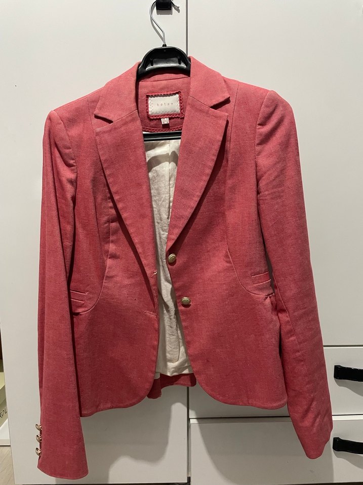 Düğmeli, keten kumaştan yapılmış, parlak pembe renkte kadın blazer ceket. Normal midi boyda, regular fit ve uzun kolludur. Ofis ve günlük şık kombinlere uygundur.