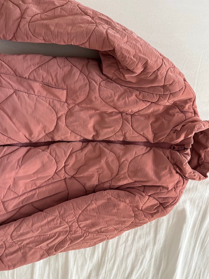 Pembe keten kumaştan, düğmeli, yüksek yakalı, uzun kollu ve midi boyda, rahat sokak stili kadın ceketi.