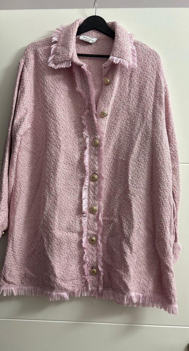 Pembe keten kumaştan, düğmeli, uzun kollu ve yakası kesik detaylı bol kesim gömlek. Kenarlarında püskül süslemeleri bulunur. Rahat ve bohem tarz için uygun.
